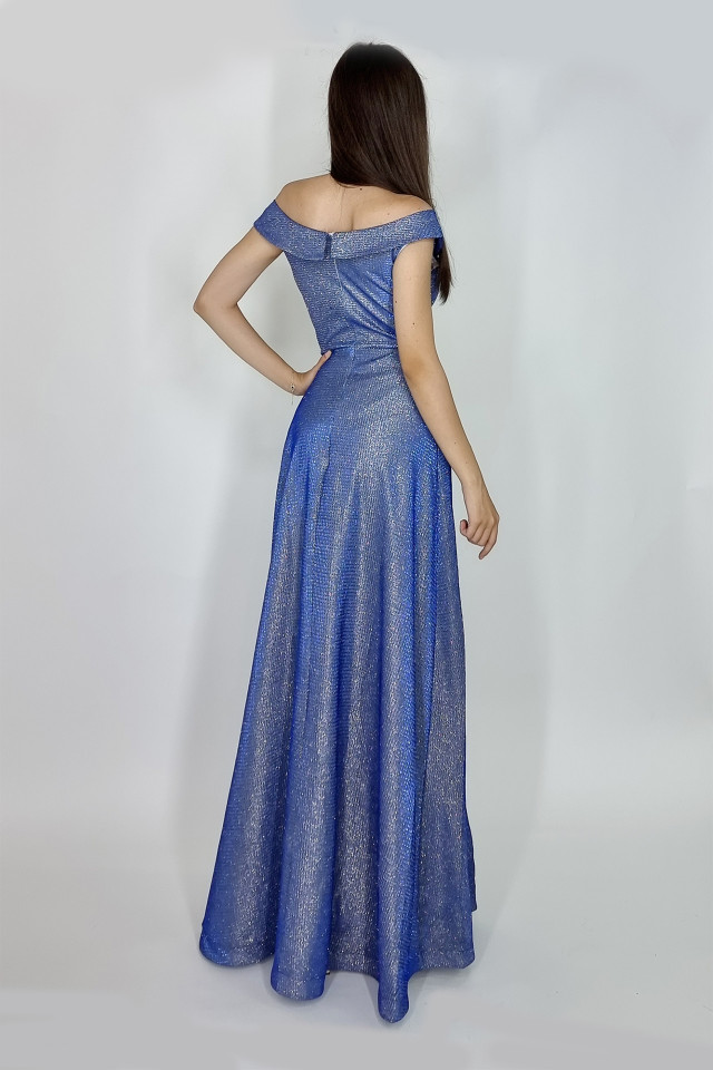 Rochie lungă albastră din polyester cu pliuri și decolteu pe umeri