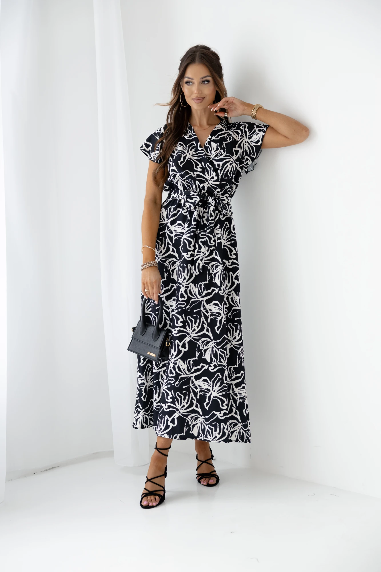 Rochia lungă neagră cu imprimeu alb și cordon în talie redefinește eleganța prin simplitate și rafinament. Creată pentru a deveni piesa de rezistență a garderobei tale, această rochie se evidențiază prin designul său sofisticat.