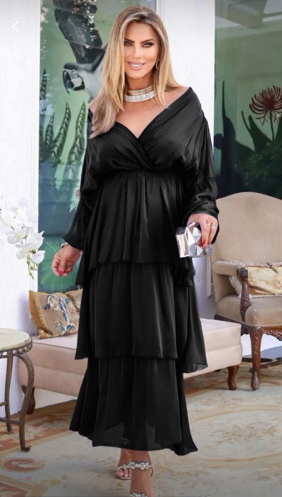 Rochie lungă elegantă neagră din mătase cu volane și mânecă lungă