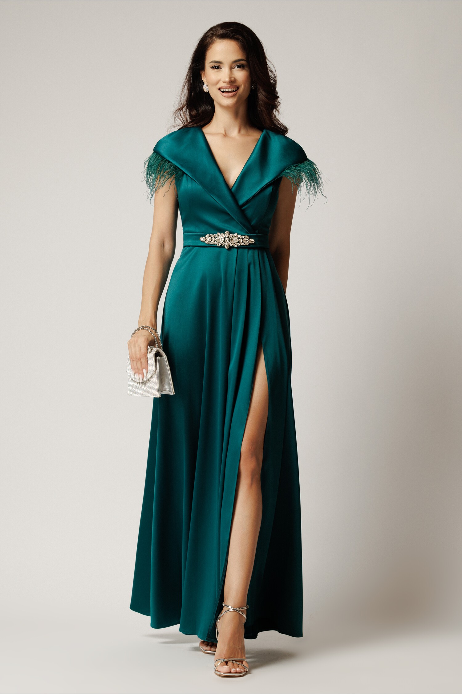 Rochie lunga verde din tafta cu pene la umeri si strasuri pe talie