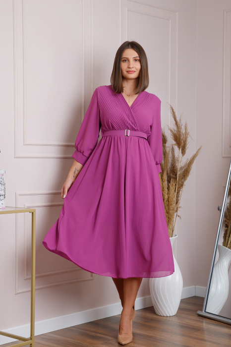 Rochie fucsia din material lejer cu bust petrecut și curea în talie – Reducere 17.22 %