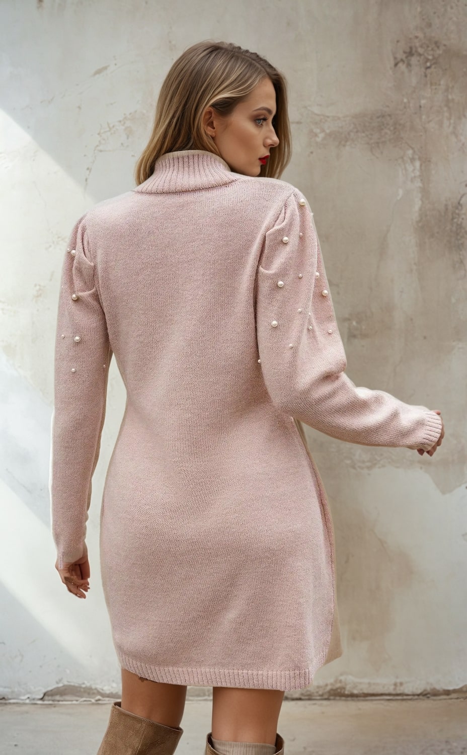 Rochie pulover roz pudrat cu perlute și guler înalt – Reducere 24.43 %
