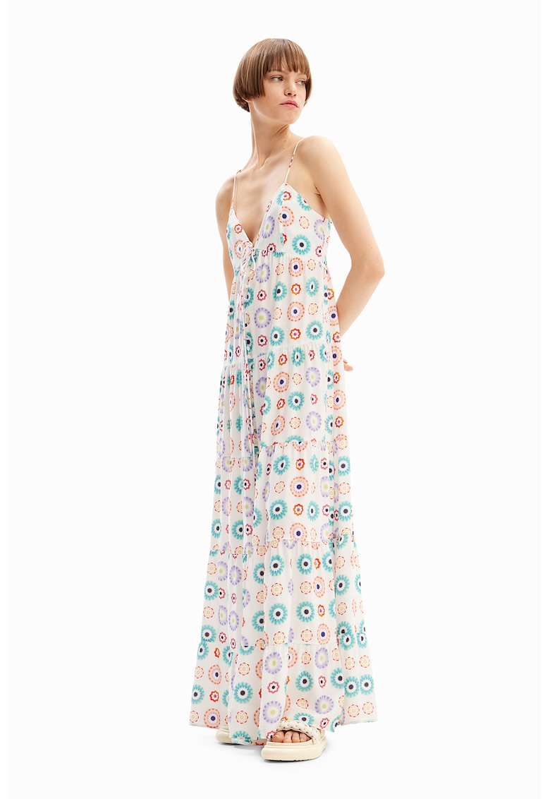 Rochie maxi cu model si decolteu in V – Alb fildes/Violet/Turcoaz