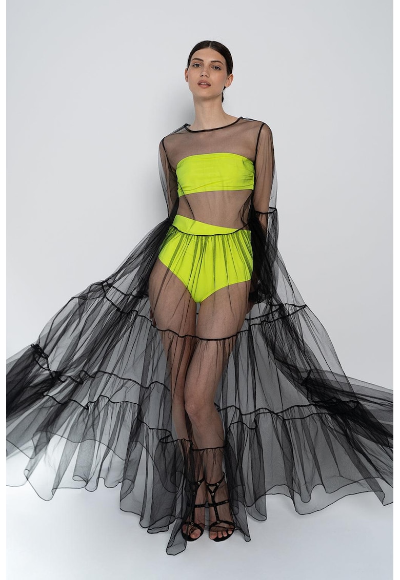 Rochie elegantă neagră din tul transparent cu maneci bufante – Reducere 45 %
