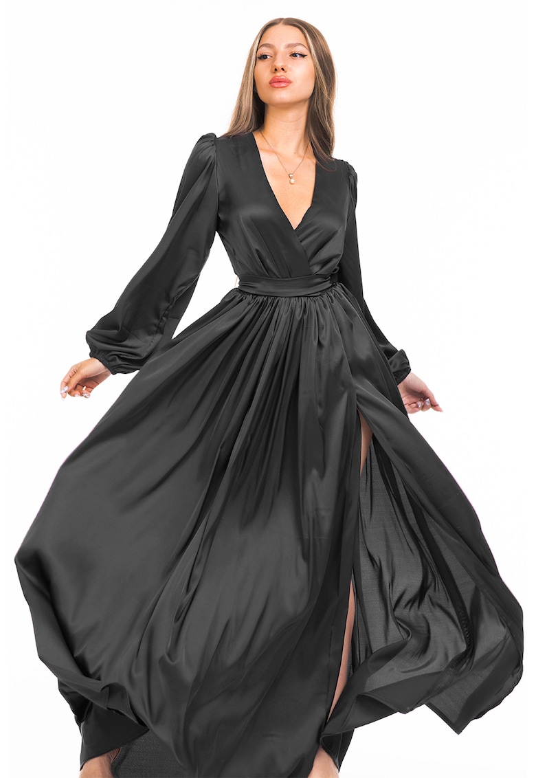 Rochie maxi evazata cu slit si model petrecut – Negru stins