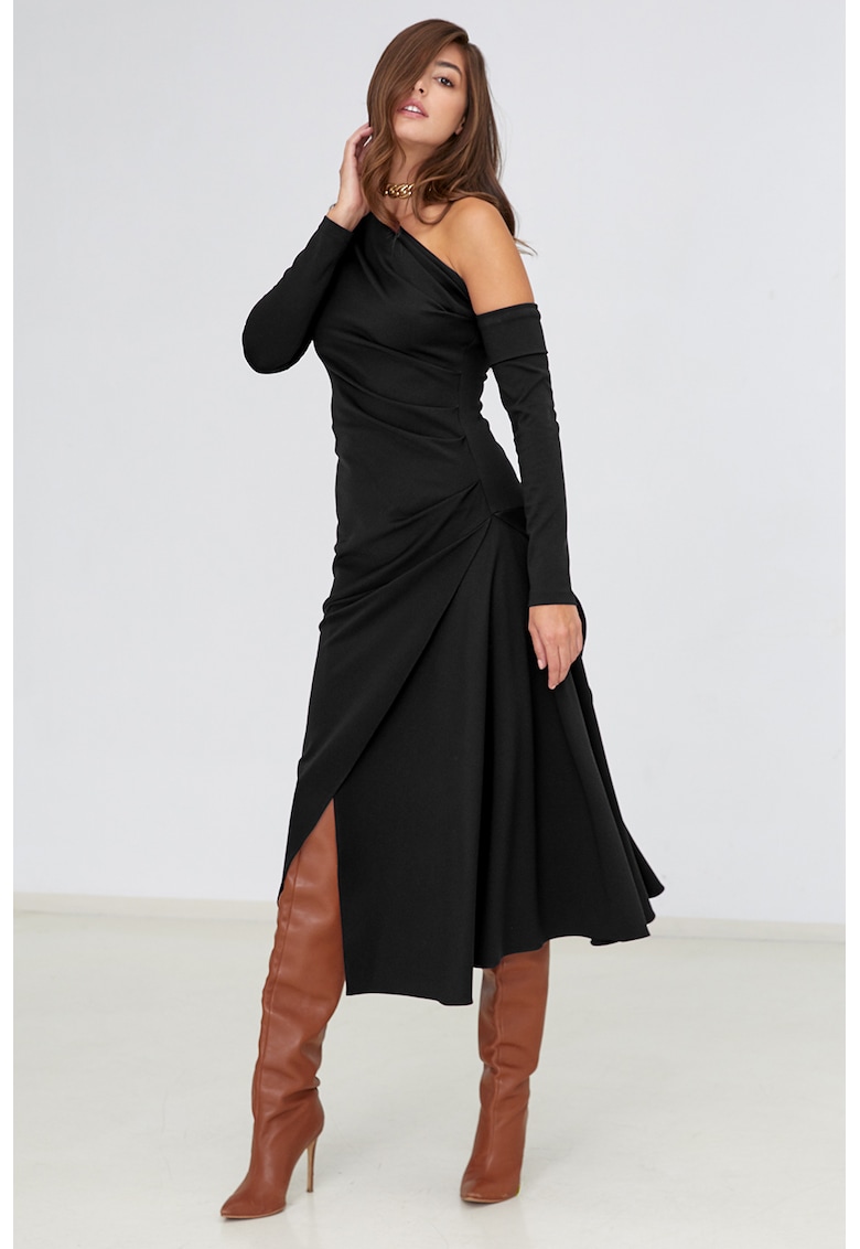 Rochie elegantă neagră midi asimetrică din viscoză – Reducere 46.43 %