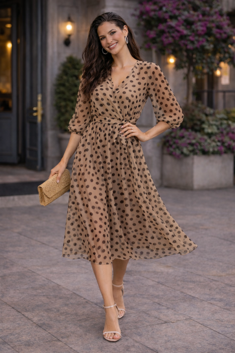 Îndrăznește să strălucești în bej cu bulinute negre. Perfect pentru zilele de primăvară, o alegere ideală pentru stilul tău casual.