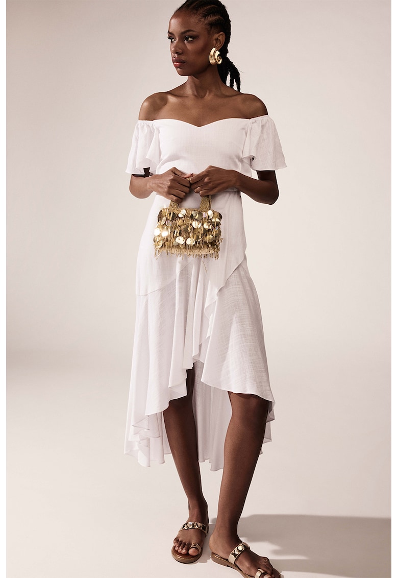 Rochie midi albă din in cu decolteu pe umeri – Reducere 50.56 %