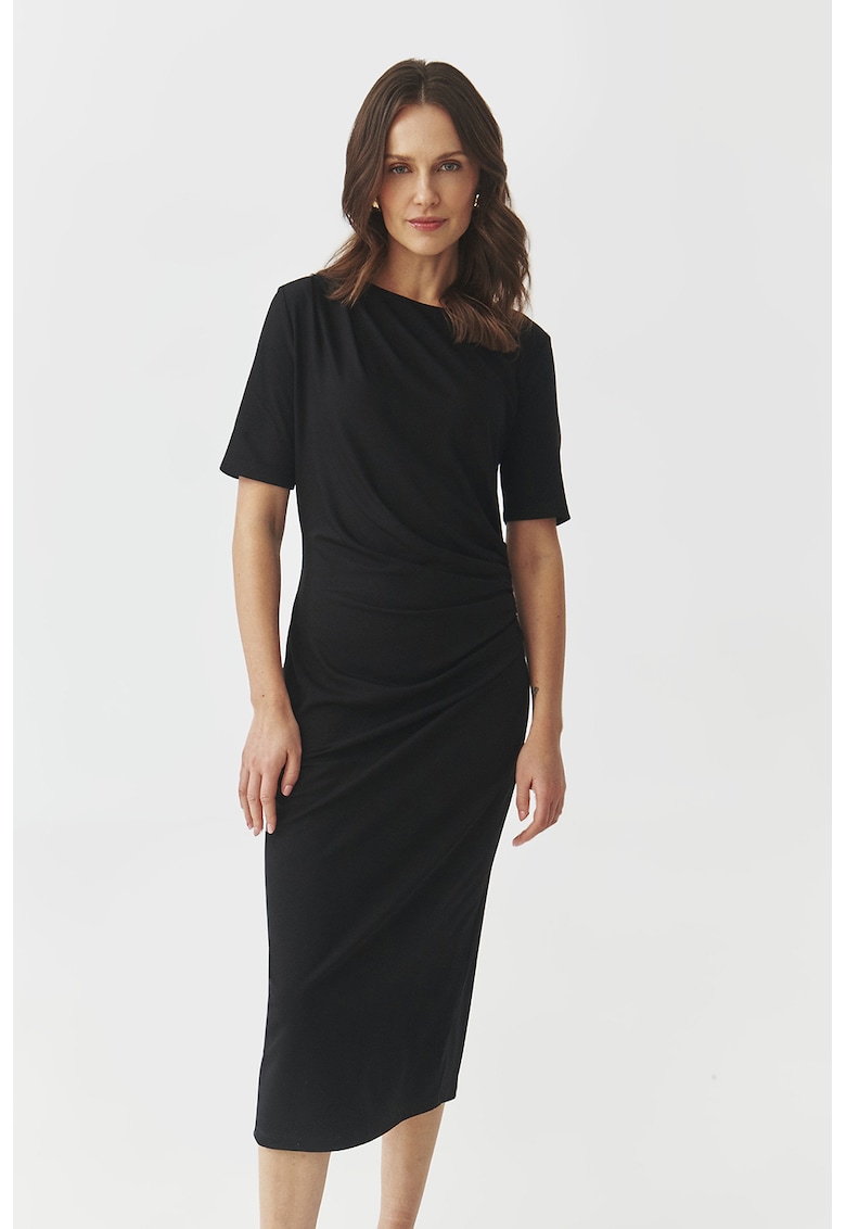 Rochie elegantă neagră midi din viscoză cu aspect drapat – Reducere 43.03 %