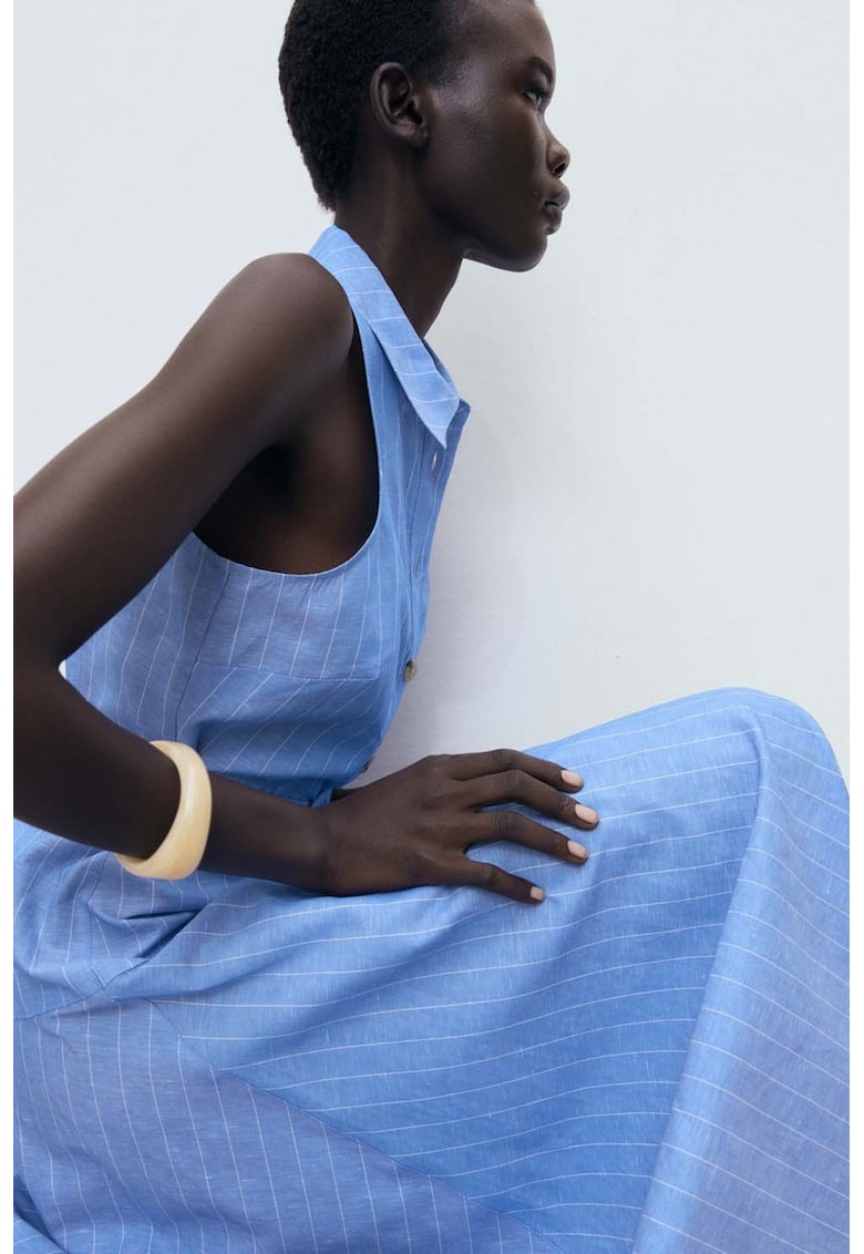 Rochie midi albastră deschisă din in cu imprimeu dungi – Reducere 60.47 %