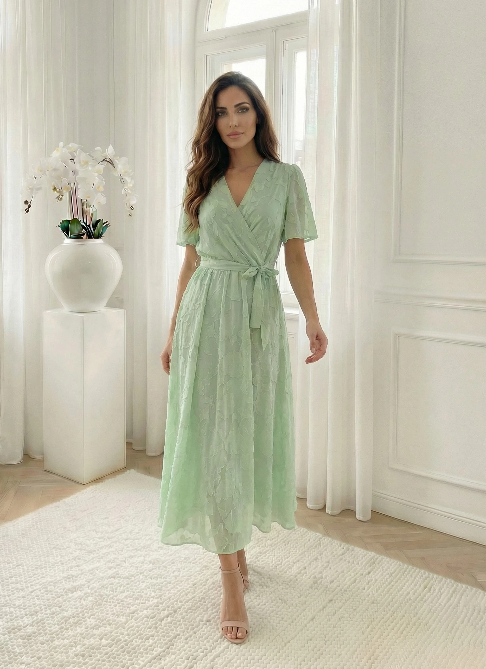 Rochia midi elegantă verde menta îmbină rafinamentul cu o notă de prospețime, fiind alegerea ideală pentru ocazii speciale. Designul său cu textură florală adaugă o dimensiune deosebită, iar croiul petrecut, ce se conturează delicat pe talie, creează o siluetă feminină și sofisticată. Cordonul din talie oferă un plus de ajustabilitate, permițându-ți să îți pui în valoare formele.
