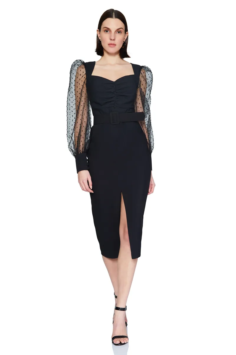Rochia midi neagră de damă cu mânecă lungă din tulle Carla este alegerea ideală pentru evenimentele speciale din viața ta. Această piesă vestimentară reușește să combine eleganța cu un aer modern, având un design sofisticat ce se remarcă prin detalii atent lucrate.