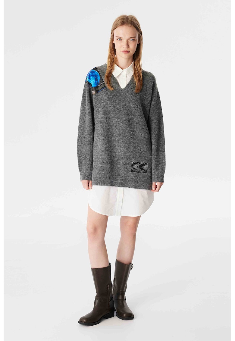 Realizată dintr-un mix calitativ de poliester, lână, poliamidă și acril, îți va asigura confortul necesar pe parcursul întregii zile. Decolteul în V și gulerul ascuțit adaugă o notă de eleganță, în timp ce manecile lungi, cu un design cazut, oferă practicitate și stil. Această piesă poate fi purtată cu ușurință fie la birou, fie la o ieșire casual cu prietenii, adaptându-se cu ușurință la diferite ocazii.