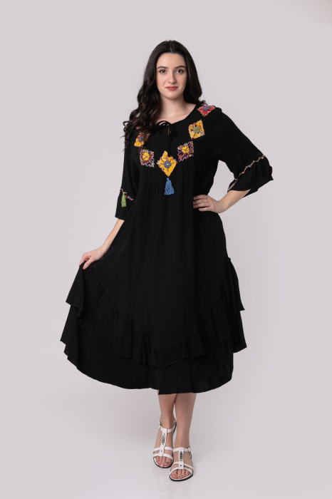 Rochia neagră boho chic cu romburi și ciucuri este o alegere fabuloasă pentru zilele călduroase de primăvară. Cu un croi în A, acest model se potrivește perfect oricărei siluete, accentuând feminitatea și confortul. Mânețile lejere de tip 3/4 adaugă un plus de eleganță, având volane delicate la terminare care oferă o notă jucăușă.