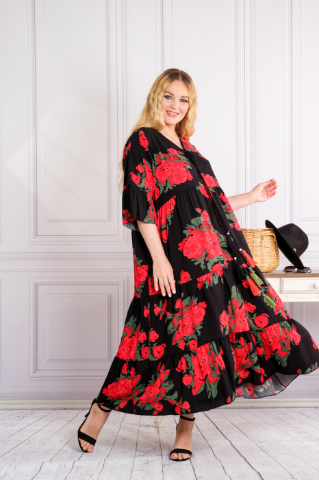 Rochie lungă neagră boho chic cu imprimeuri florale roșii – Reducere 24.16 %