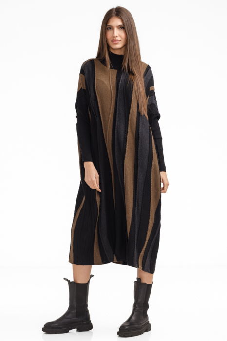 Rochie oversize tricotata cu dungi unduitoare si croi lejer, negru-camel