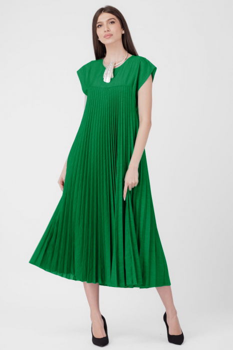 Rochie plisata A-line lunga, material fin si usor creponat, verde