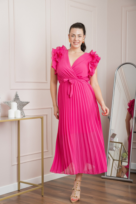 O alegere ideală pentru evenimente: rochia plisată ciclam cu volane. Rafinament și confort într-o singură piesă.