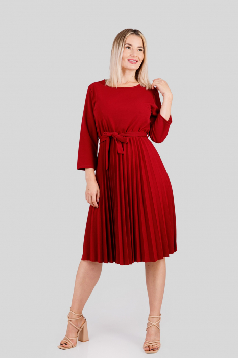 Rochie plisata grena cu maneci trei sferturi si cordon in talie