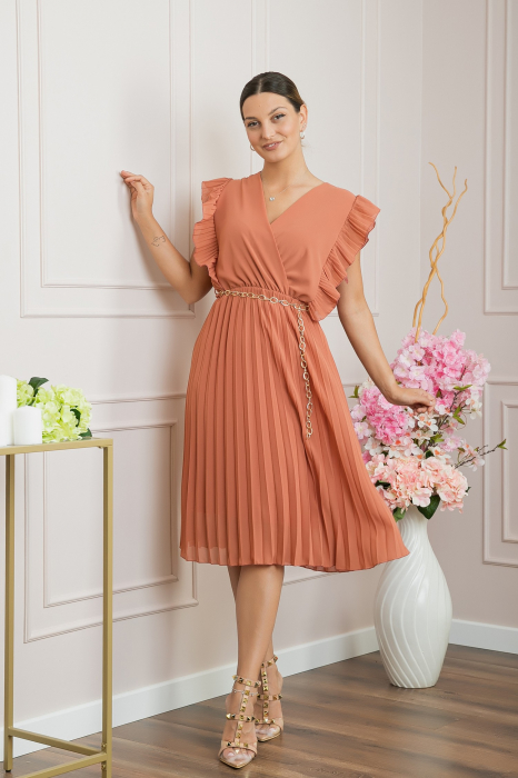 Rochie plisata orange piersica cu volane si lantisor decorativ in talie