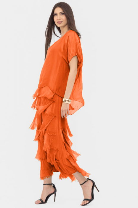 Rochie portocalie din matase si vascoza cu volane franjurate suprapuse