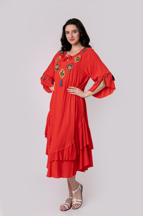 Rochie boho roșie din material textil cu romburi și ciucuri – Reducere 23.19 %