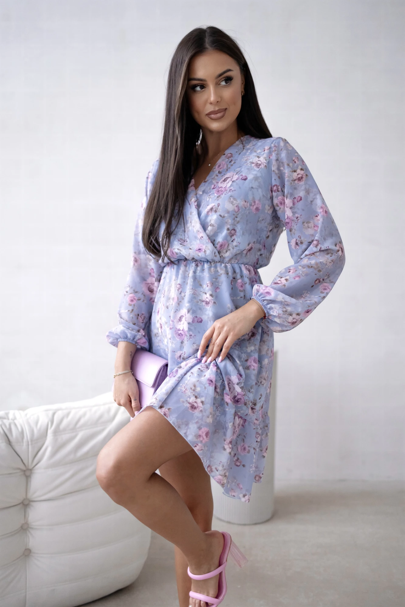 Rochia scurtă bleu cu imprimeu floral este alegerea perfectă pentru zilele călduroase de vară. Această piesă delicată și feminină, cu un decolteu în V, aduce un aer fresh și vibrant garderobei tale.