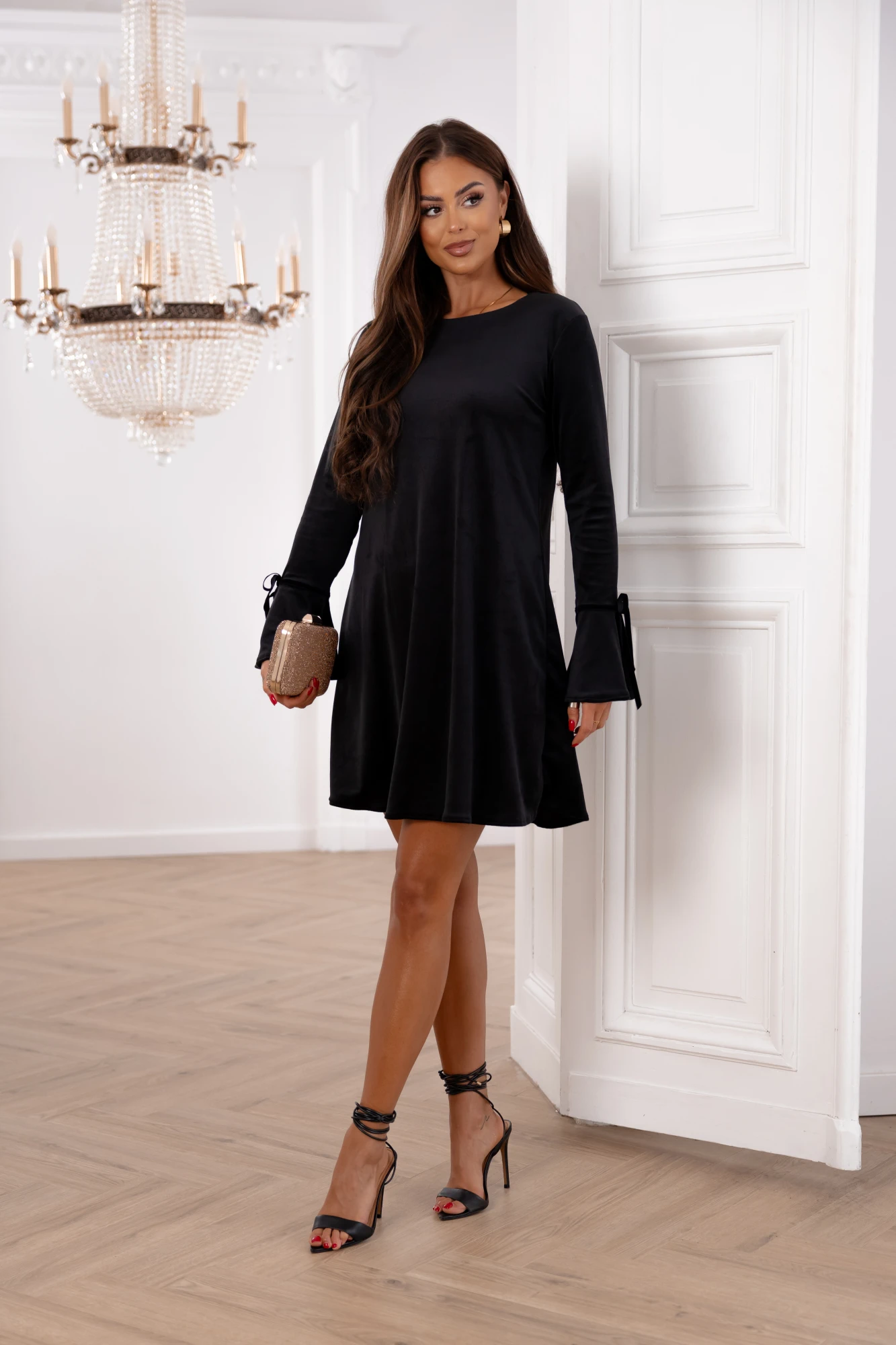 Rochie scurtă neagră din catifea cu maneci evazate și fundițe decorative – Reducere 36.12 %