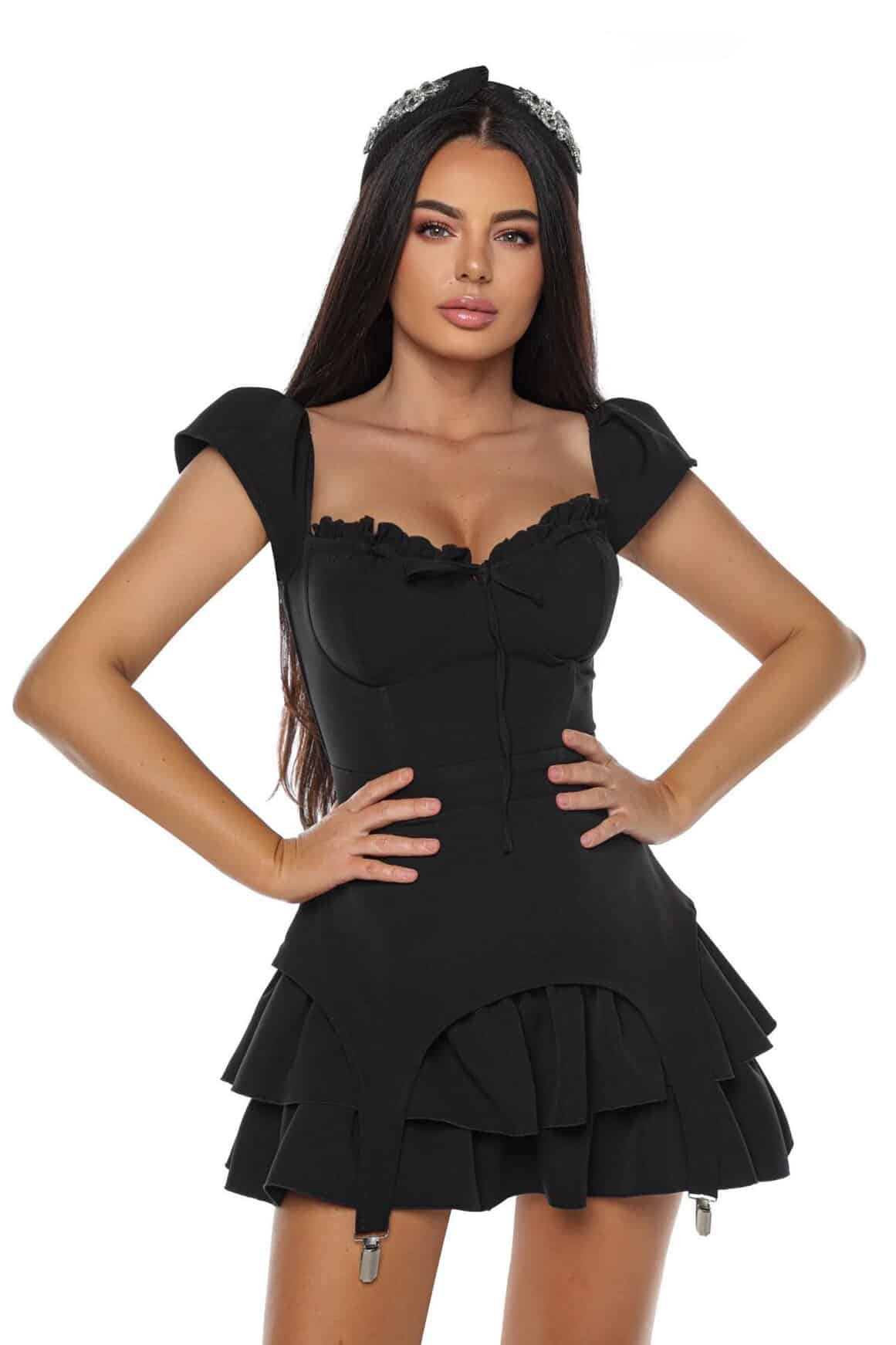 Volanele fine adaugă un aer diafan, în timp ce cele patru barete tip portjartier oferă un accent sexy atât în față, cât și în spate. Fie că alegi să o porți cu pantofi stiletto sau cu sandale elegante, această rochie va transforma orice ținută într-o declarație de stil.