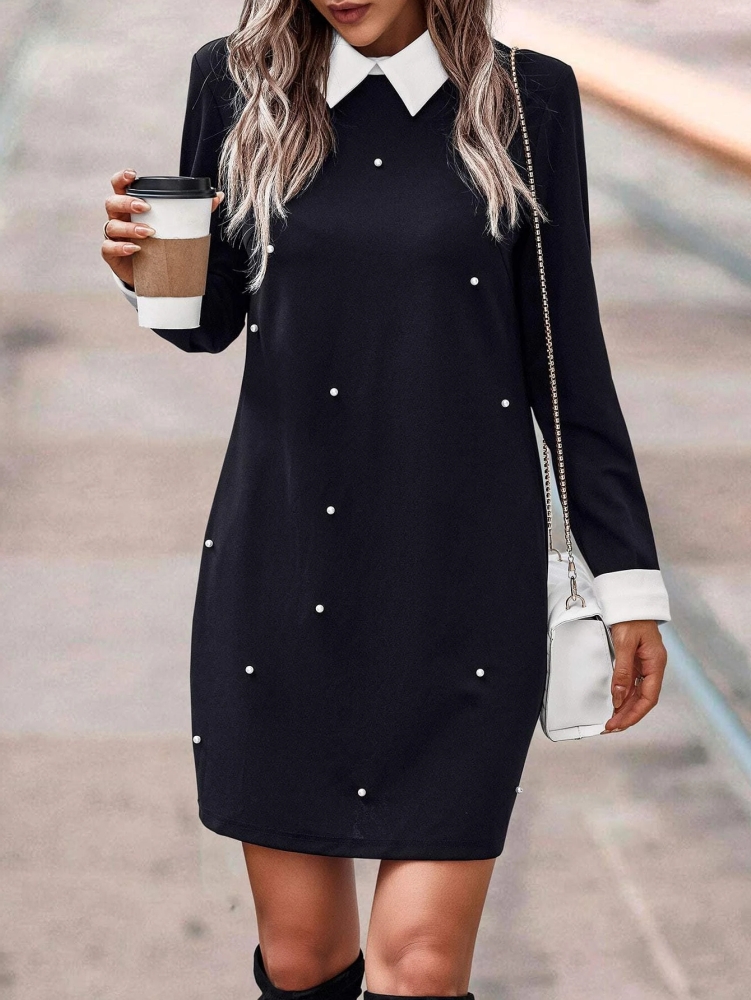 Rochie elegantă neagră din poliester cu guler alb și perlute – Reducere 66.97 %