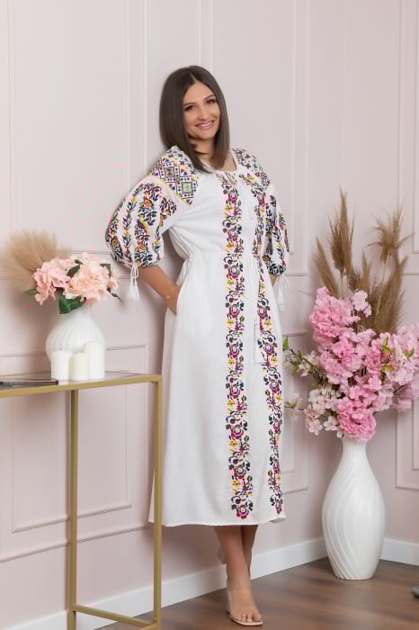 Rochie tradițională albă cu broderie florală multicoloră – Reducere 27.39 %