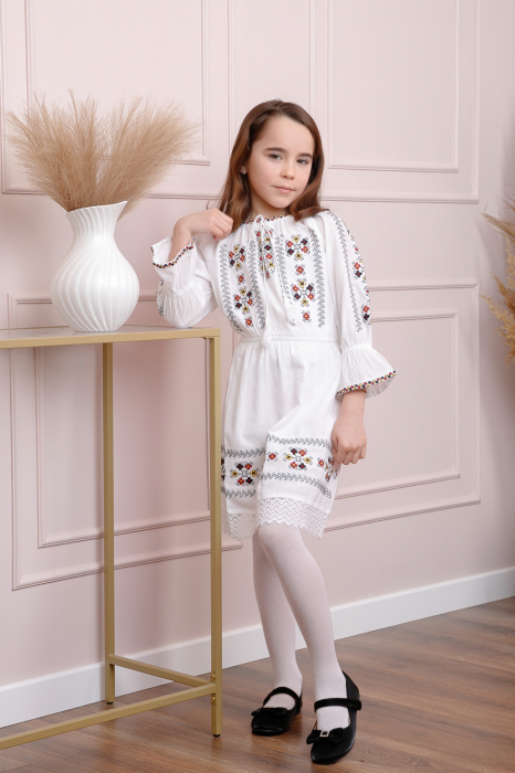 Rochie traditionala alba pentru fetite cu motiv floral multicolor Romanita