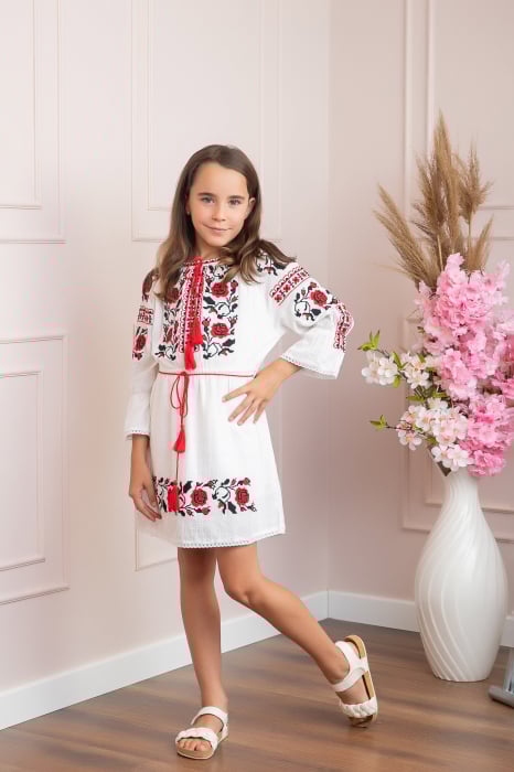 Rochie traditionala alba pentru fetite cu motiv floral rosu Emma