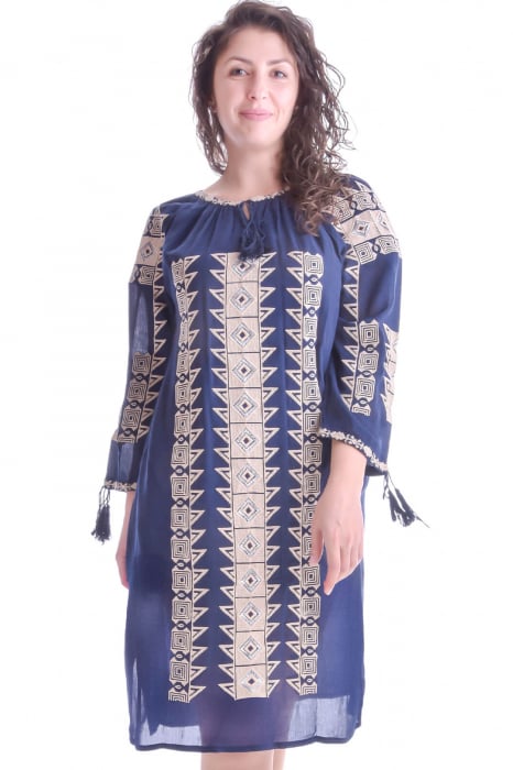 Rochie tradițională albastră din celofibra cu motive geometrice – Reducere 17 %