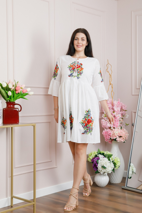 Îmbrăcă-te în eleganța tradițională cu rochia evazată albă Melania 02. Confecționată din viscoză, această rochie aduce un strop de autenticitate în garderoba ta, fiind perfectă pentru zilele senine de vară sau ocaziile speciale.