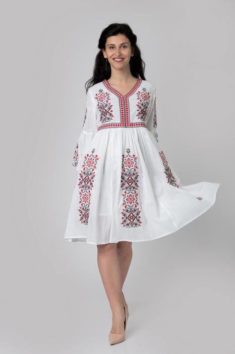 Rochie tradițională albă evazată din bumbac cu motive geometrice roșii – Reducere 27.1 %