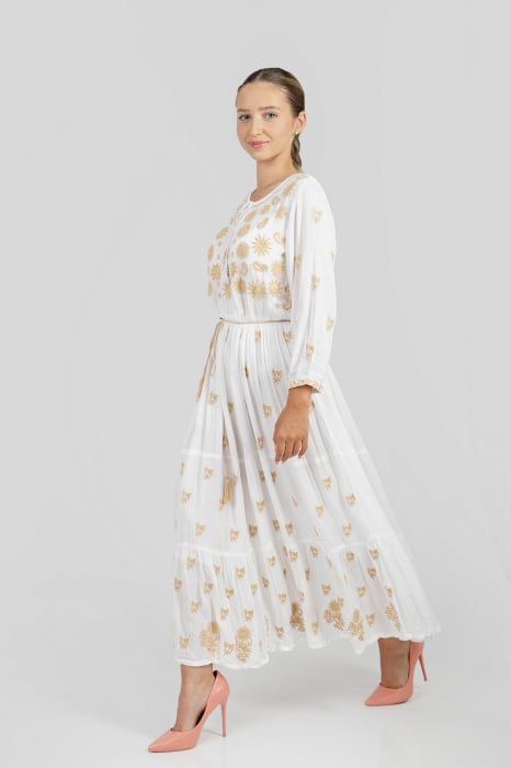 Rochie tradițională albă maxi din rayon cu motive florale aurii – Reducere 29.62 %