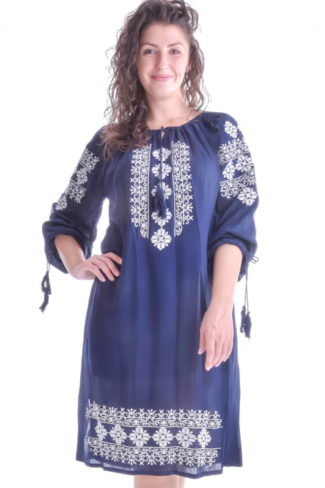 Rochie tradițională albastră midi din bumbac cu motive florale – Reducere 23.92 %