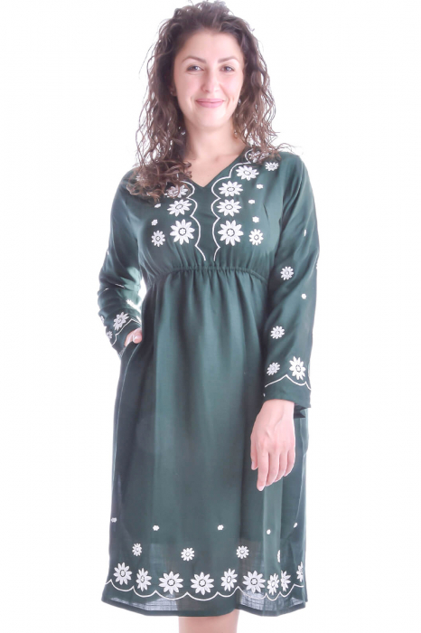 Rochie tradițională verde midi din bumbac cu motiv floral alb – Reducere 23.92 %