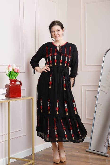 Rochie tradițională neagră din viscoză cu broderie florală – Reducere 33.33 %