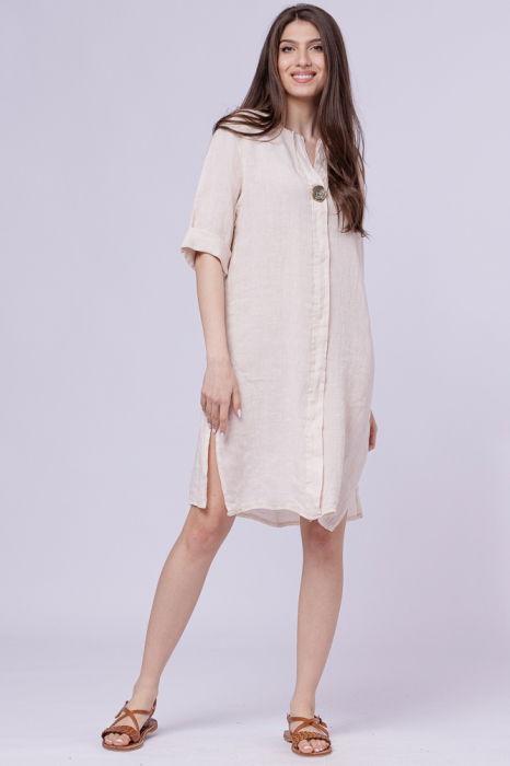 Rochie tunica din in bej, cu nasture metalic decorativ