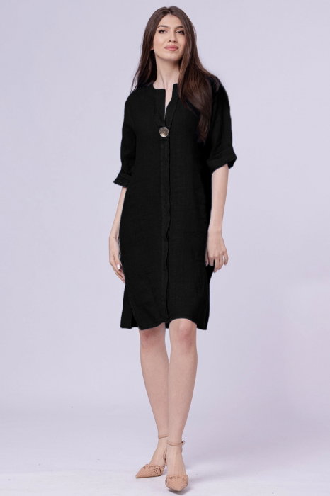 Rochie tunică neagră din in cu nasture metalic decorativ – Reducere 15 %