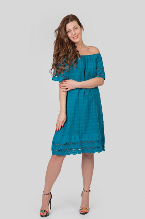 Rochie turcoaz din bumbac cu detaliu perforat și croi A-line – Reducere 24.46 %