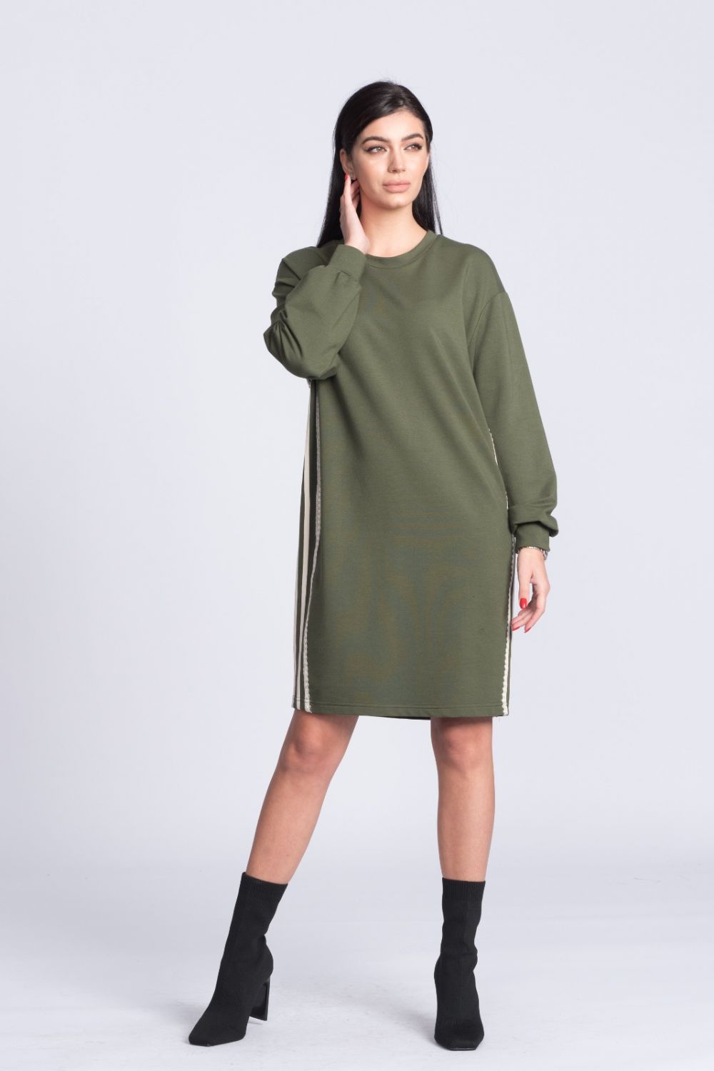 Rochie Xara casual kaki prevazuta cu benzi decorative pe lateral
