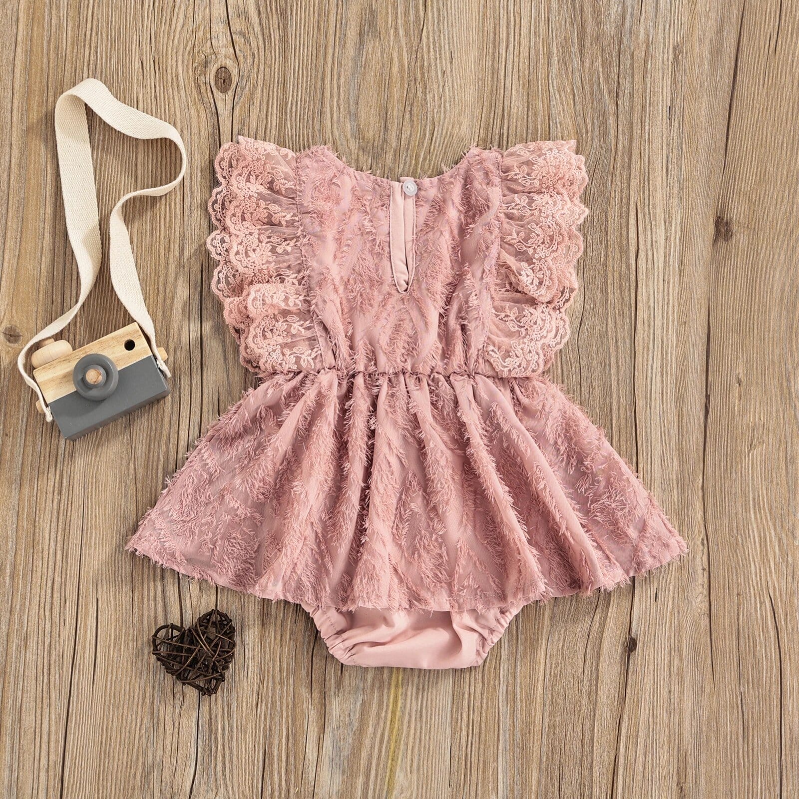 Croiul scurt se îmbină armonios cu detaliile de broderie și dantelă elastică în talie, adăugând un strop de eleganță și rafinament. Închidere cu nasture la spate și capse în partea de jos fac din această rochiță o alegere practică și ușor de purtat.
