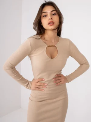 O alegere ideală pentru ocazii: rochie midi bej, confortabilă și elegantă. Perfectă pentru a străluci în momente speciale.